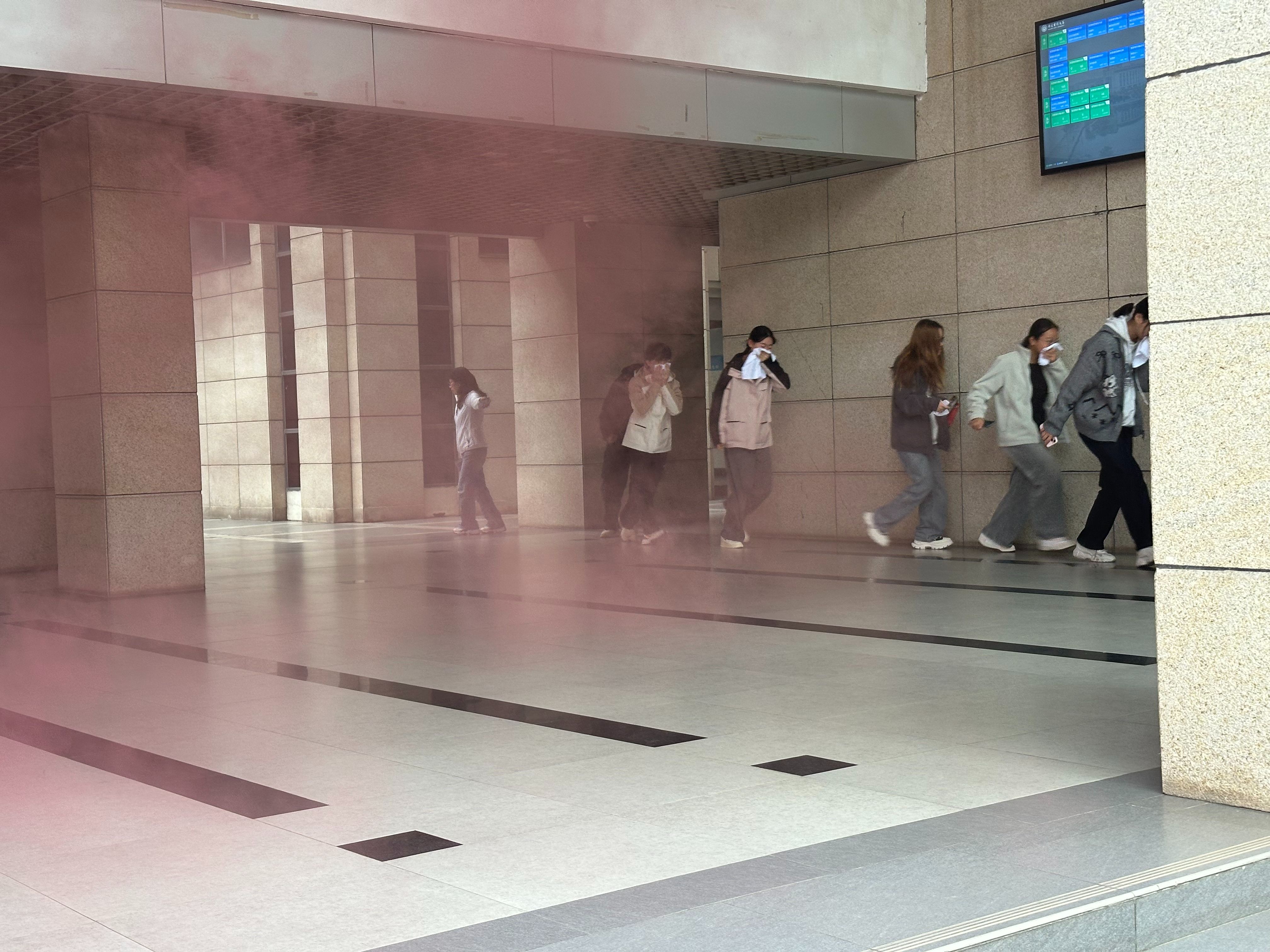11时整,现场总指挥下达“演练开始”指令,模拟火情触发后,任课教师立即停止授课,迅速组织学生采用低姿、捂鼻的防护姿势,沿东侧安全出口快速、有序撤离。全体人员在3分钟内安全抵达指定集合区域,各班人员清点后逐一向指挥中心报告,实现了“无人员滞留、无意外跌倒、无上报误差”的演练目标,过程紧张有序,效果显著。